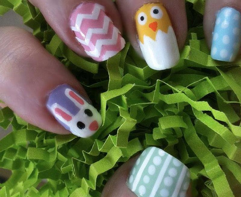 Для этого образа выберите разные пастельные тона для фона каждого ногтя, убедившись, что один из них желтый. Добавьте белила к нижней части желтого гвоздя, чтобы сформировать вылупившегося цыпленка. На другом ногте белым цветом нарисуйте мордочку кролика с ушками. Завершите цыпленка и кролика черными глазами, добавив розовые штрихи к ушам и носу кролика и оранжевую точку к клюву цыпленка. Добавьте белые точки, линии или полоски шеврона на оставшиеся ногти.