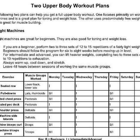 Следующие два плана помогут вам получить полноценную тренировку для верхней части тела. Один из них ориентирован в первую очередь на тренажеры и является отличным планом для повышения тонуса и похудания. В другом упражнении используются преимущественно свободные веса, и он отлично подходит для наращивания мышечной массы.