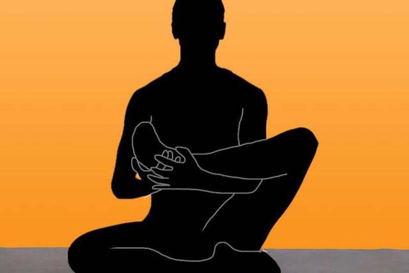 - Возьмите правую пятку левой рукой и правое колено правой рукой, дышите ровно, сидите прямо и держите правую икру параллельно полу.