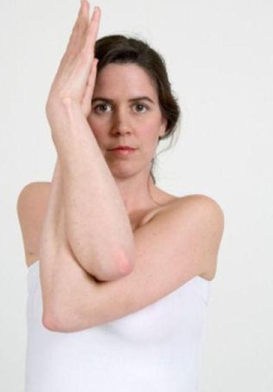 Согните руки в локтях к себе и на сгибе положите правый локоть на сгиб левой руки, поворачивая ладони друг к другу настолько близко, насколько позволяет ваша гибкость. Кончики пальцев должны тянуться к потолку.