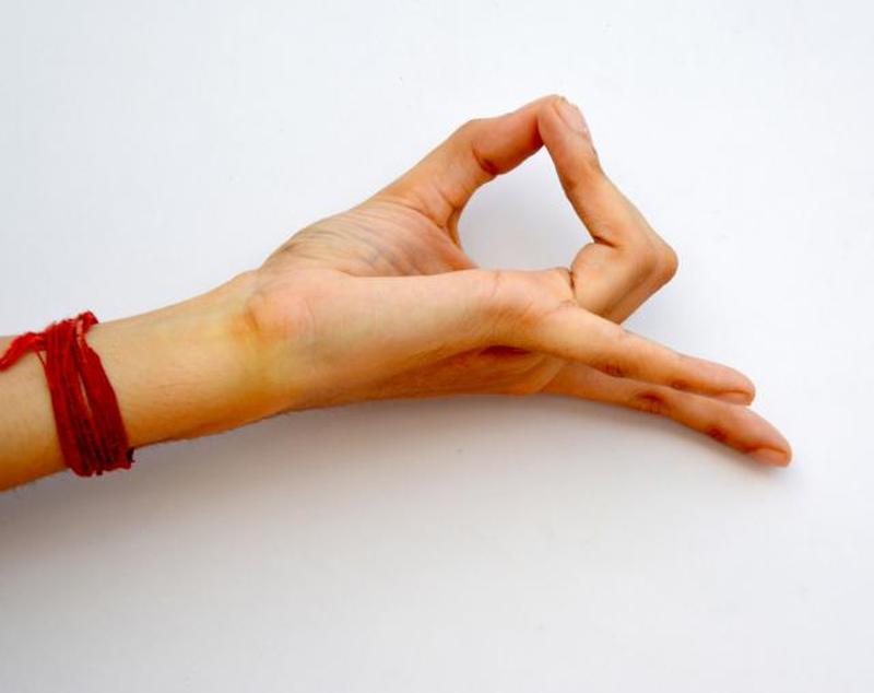 - Прикоснитесь кончиком большого пальца левой руки к кончику среднего и безымянного пальцев левой руки.