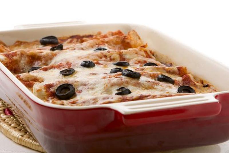 Повторите шестой и седьмой шаги, сделав еще два слоя соуса, оливок, сыра и лепешек, и закончив слоем пропитанных лепешек. Вылейте оставшийся соус поверх лепешек и посыпьте оставшимся сыром.