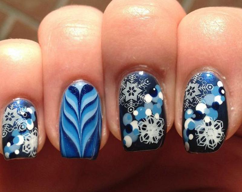 Выберите как минимум четыре разных оттенка синего лака для ногтей и один белый, чтобы создать такой образ. Снежинки легко сделать с помощью пластин для стемпинга и белой краски для нейл-арта.