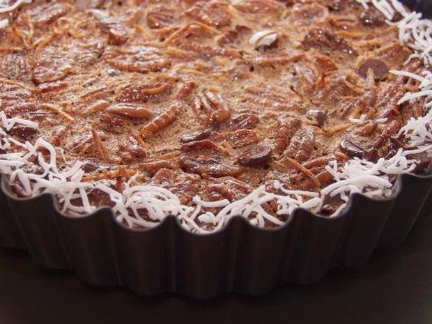 - Пока пирог еще теплый, вдавите в него целые поджаренные орехи пекан в виде декоративного узора.